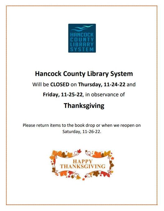 We will be closed on Thursday, 11-24, and Friday, 11-25, for the Thanksgiving holiday. We will be open on Saturday, 11-26-22.